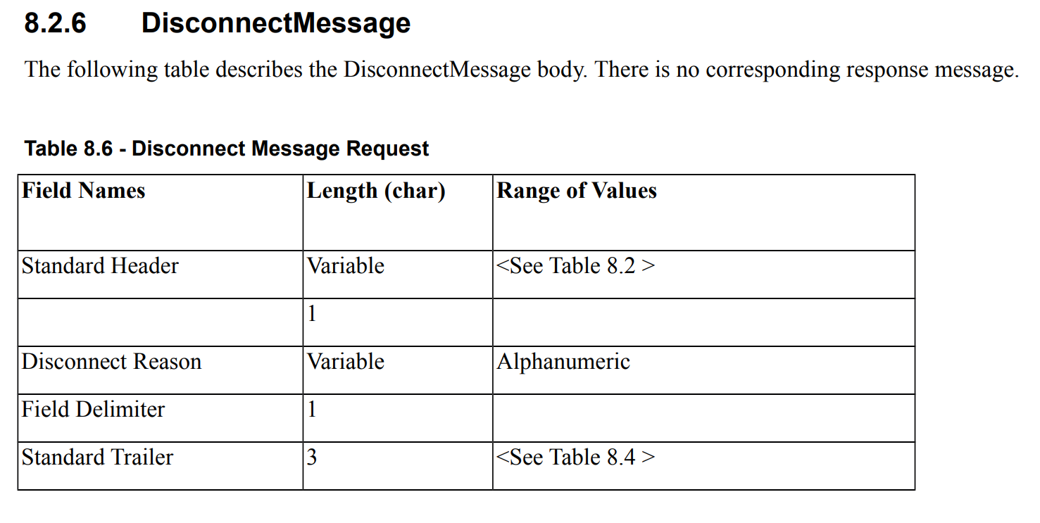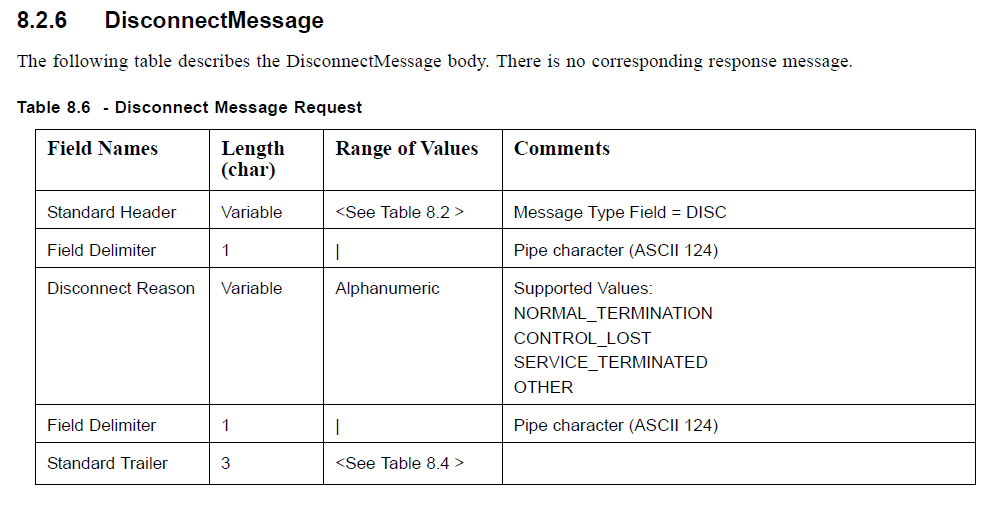 In the GEMS version 1.4 specification ASCII PSM, Table 8.6 for the "Disconnect Message Request" is missing the "Comments" column which contains certain interface details, e.g. Message Type Field = DISC.