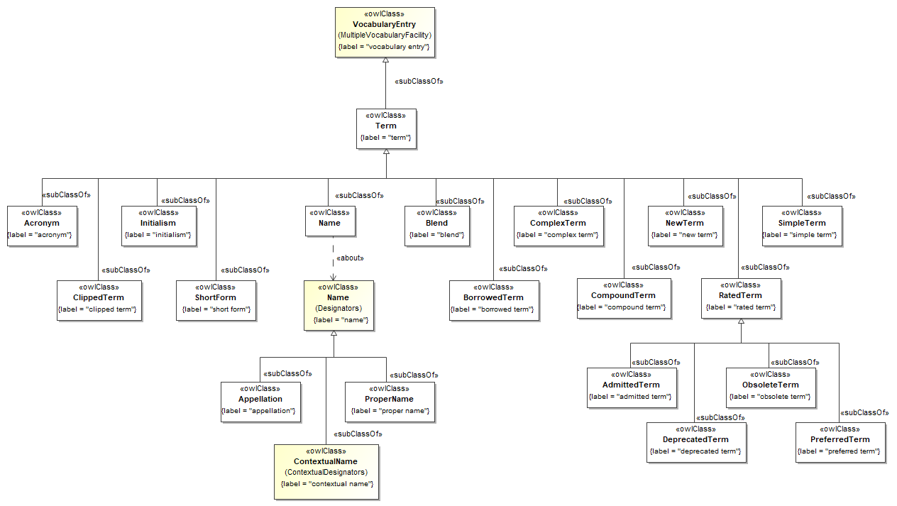 Both the metamodel and ontology include a class called abbreviation, which is a subclass of vocabulary entry. This seems redundant given that there is a constraint representing the notion of whether or not a given vocabulary entry is in fact an abbreviation.